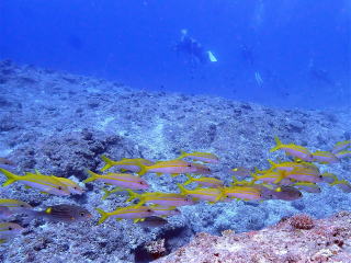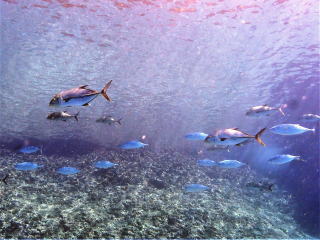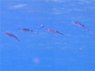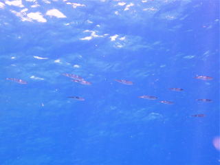グルクンがたくさんいました。オニヒラアジ・スマガツオ・カスミアジ・アオウミガメ・タイマイ・アオリイカなど、たくさんの生き物が見られて楽しめました。11時20分前に船に戻りました。